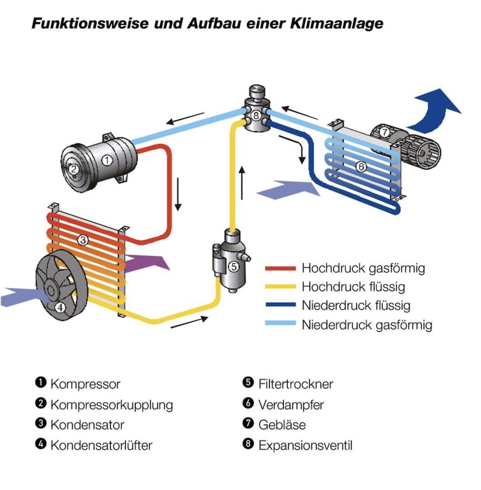 In diesem Schema wird erklärt wie eine Klimaanlage funktioniert. Der Kompressor, welcher ein wichtiger Teil ist treibt das ganze System an. Er wird über einen Schalter im Innenraum zu- oder abgeschaltet. Ist er zugeschaltet beginnt der Kreislauf, es können, wie beim Motor, Ablagerungen und Verschleissteile entstehen. Durch diese Verunreinigungen kann der Kompressor beschädigt werden, eine kostspielige Reparatur fällt an.